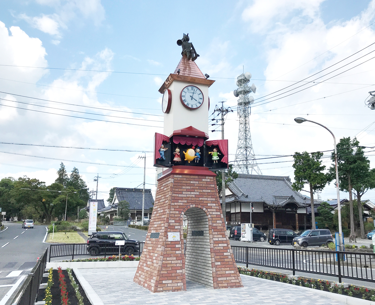 1988年に「人形劇のまち飯田」のシンボルとして設置された人形時計塔。定時になると「時の番人」のファンファーレに続き4体の人形による人形劇「マリオトピア」が演じられます。